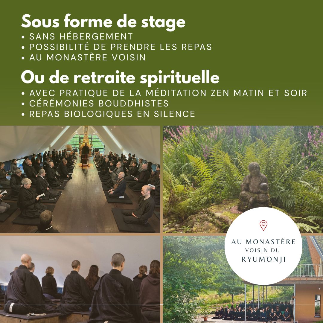 ** : Du vendredi 24 avril à 17h au dimanche 26 avril à 16h – Sous forme de retraite spirituelle ( avec pratique de la méditation zen matin et soir, cérémonies bouddhistes et repas biologiques en silence )